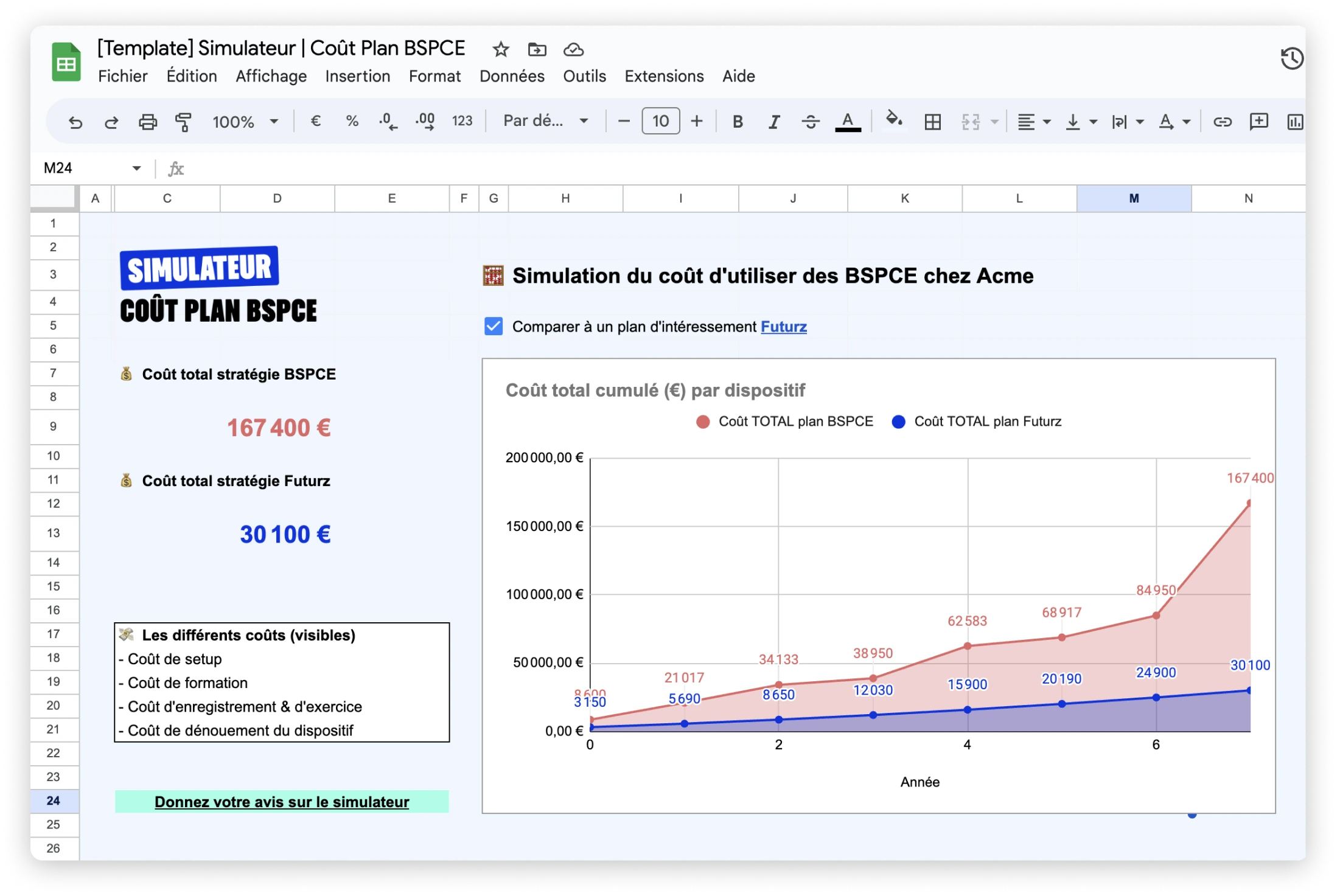 Nous vous avons donné tous les éléments pour vous permettre d’évaluer au mieux le coût réel de votre plan de BSPCE. Pour aller plus loin, nous avons créé un simulateur unique qui vous permet de vous projeter concrètement sur le coût d’un plan de BSPCE.