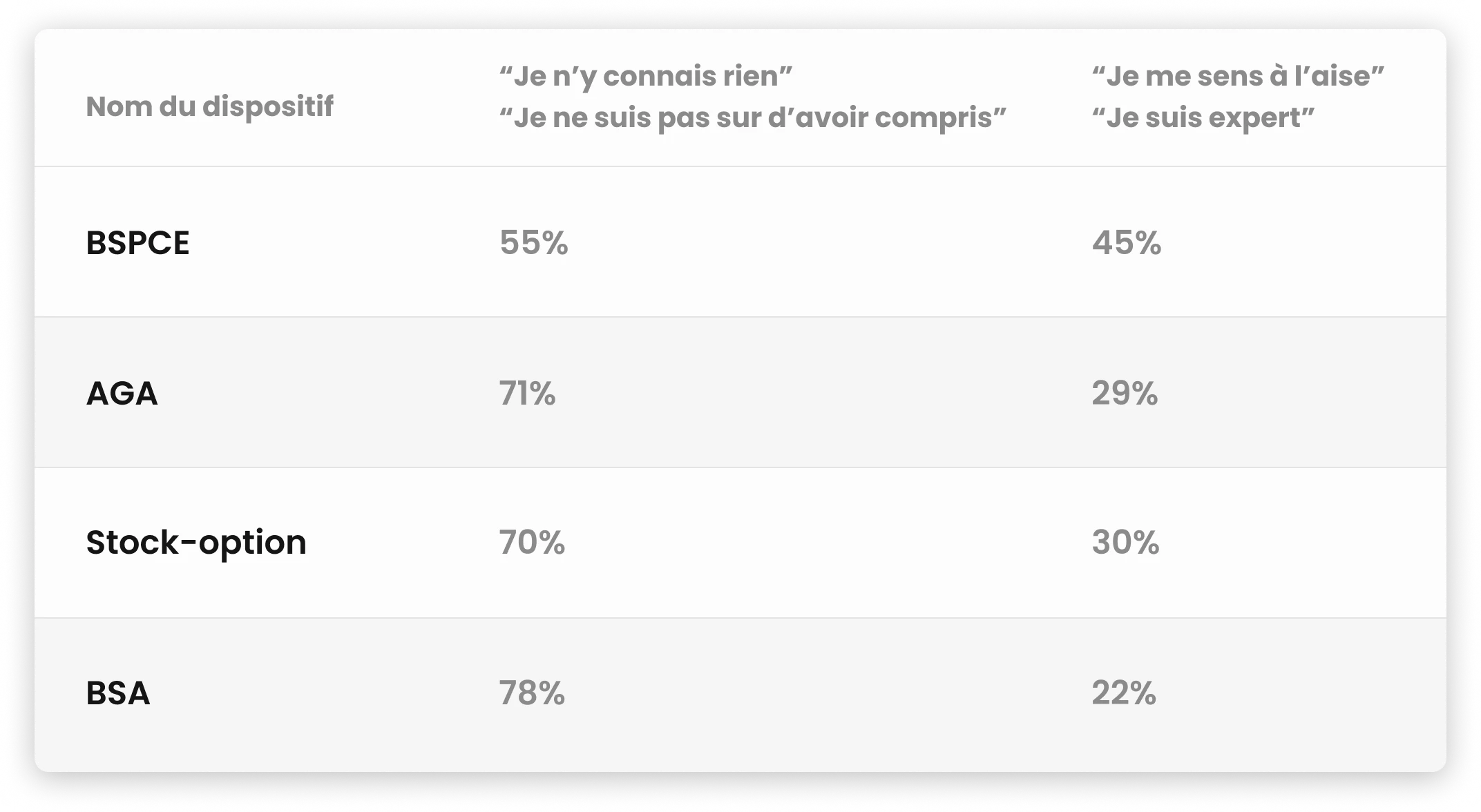 La grande majorité des personnes interrogées avouent ne pas maîtriser les dispositifs d’actionnariat salarié. Les bons de souscription d'actions (BSA) semblent être le levier le plus opaque pour les répondants : 78% déclarent ne pas avoir compris de quoi il s’agissait. Les BSPCE sont, quant à eux, l’outil le plus connu : 45% des répondants déclarent se sentir à l’aise avec cet outil.